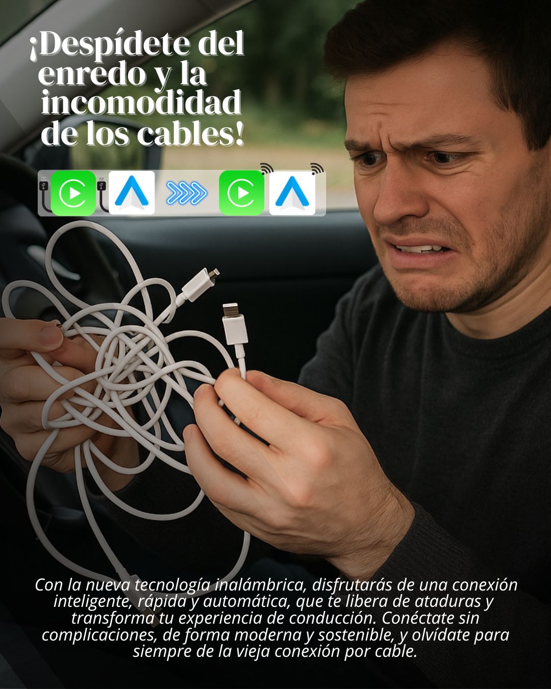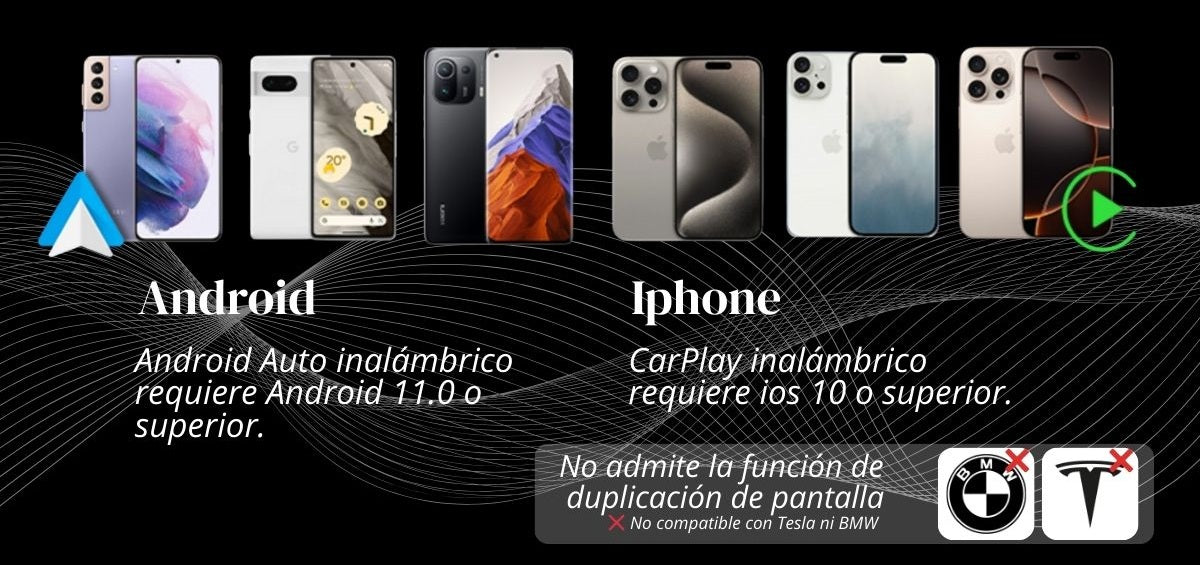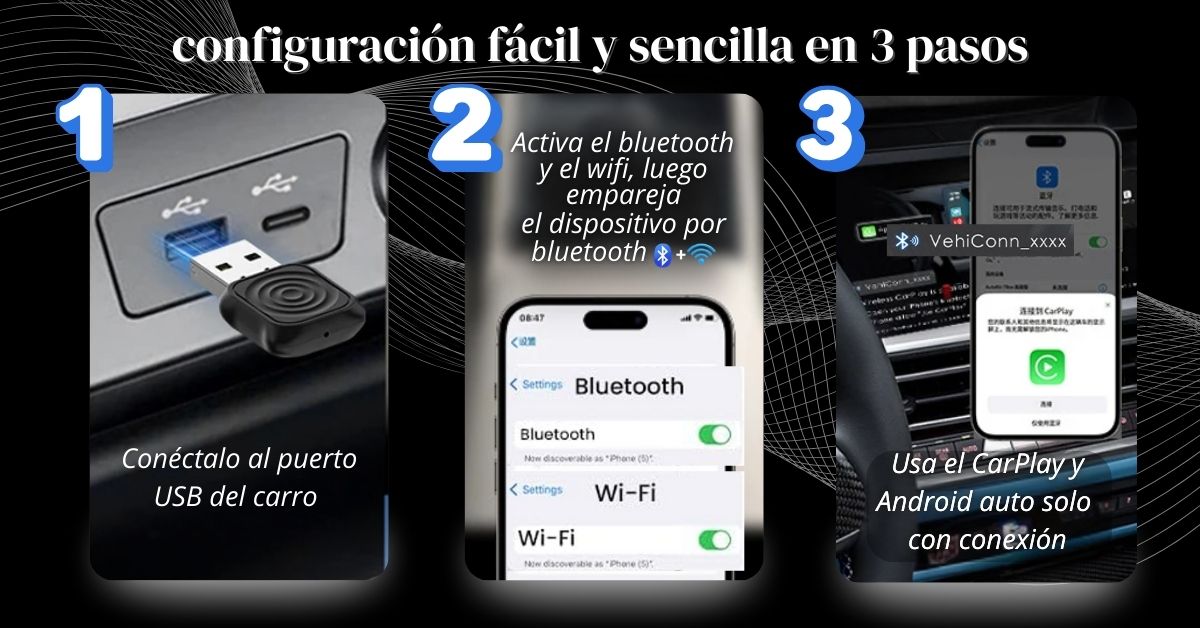 Si tu carro ya trae CarPlay con cable, en el 90% de los casos puedes volverlo inalámbrico con un adaptador USB (requiere iPhone con iOS 10+ y Bluetooth + Wi-Fi activados). Si tu auto no trae CarPlay de fábrica, necesitarás una radio/pantalla compatible con CarPlay.